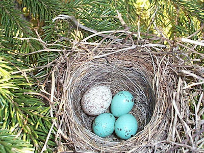 Robins are model parents of the bird world, from providing a substantial home to nurturing and feeding the nestlings and the continued feeding and protection of the fledglings as they hop around our lawns or sit in the shrubs awaiting their next meal. A particularly hazardous time for the fledgling with its very limited ability to get off the ground leaving it very vulnerable to predators the worst of which is the neighbourhood cats. Not all birds take parenting so seriously, in fact some like our Brown-headed cowbird take a particularly modern attitude and out-source the whole business. They are one of several species that are parasitic choosing to lay their egg in another species nest leaving the responsibility for hatching, feeding etc to the host bird leaving the Cowbird free to get on with its life. They usually choose a smaller species as host in this instance the nest of a Chipping sparrow and although the usurper's egg is quite different it is accepted by the sparrow.