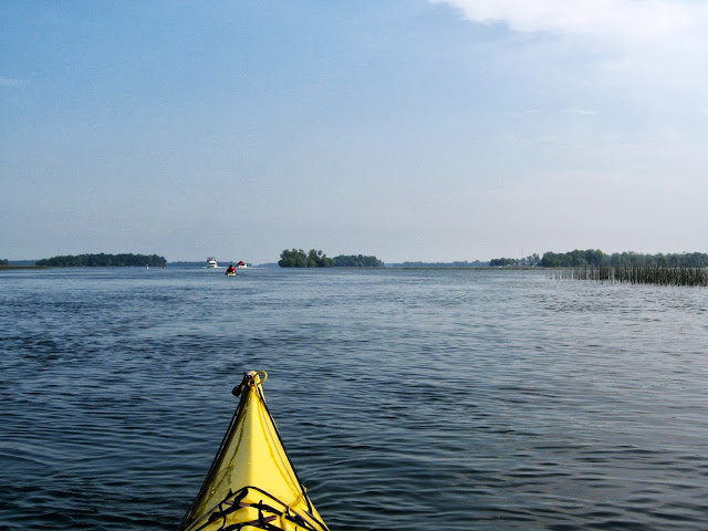 After breakfast we haul boats and gear to the far end (downstream) of the lock where there was a bit of steep rocky shore shallow enough to allow boat loading on the water. Around 09:00 we head down channel for the approx 1.5km to the exit onto Lake Simcoe. Weather forecast was favourable and as we enter the lake it was even better than we had hoped, flat calm with a bit of fog but very hot and humid.