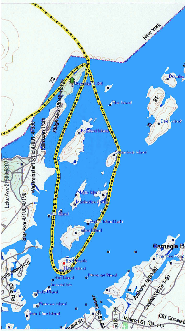 The day promised to be perfect for paddling with plenty of sunshine, light wind and an expected high of 12 c. Loading the boat on the roof of the car I wore gloves as Jack frost was very much in evidence requiring me to run the engine for awhile to clear away a heavy frost. As Heart Island is within the U.S. I downloaded a map of New York state which I loaded on my GPS, unfortunately I can't view or print both my Canadian topographic maps and New York map simultaneously so here they will appear separately although my track can still be seen running off into the missing maps. By the time I am ready to depart Rockport; 11:15 it has warmed up nicely and I set course for the NE tip of Wellsley island the start of U.S. waters a distance of 2 km. From here I will loop southward and around Heart Island before returning to this point to begin a SW course between Wellsley and Hill islands.